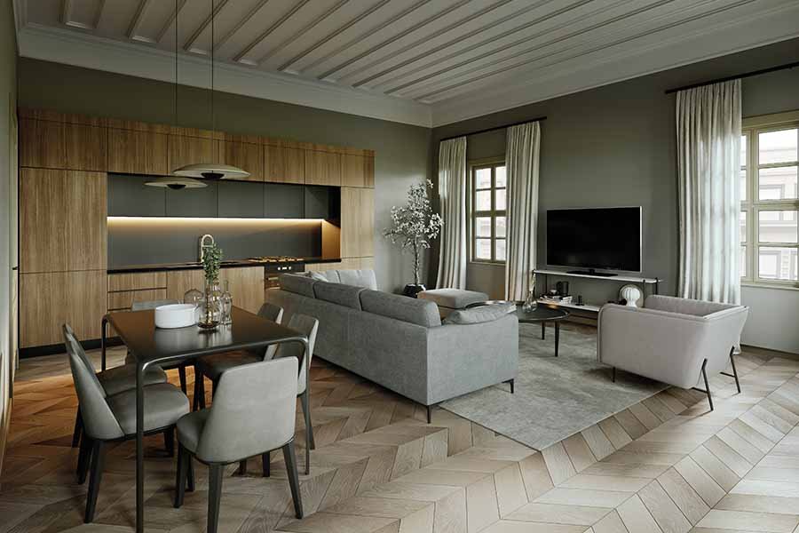 The interiors include wood flooring, premium joinery, modern kitchens, and contemporary bathrooms, ensuring a refined living environment that complements the building’s historic character.